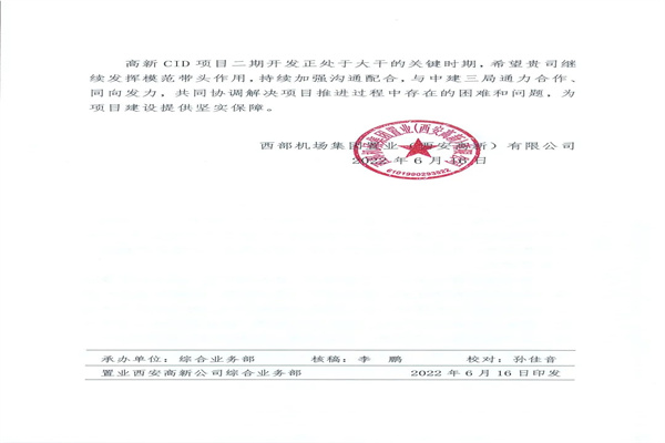西部機(jī)場(chǎng)集團(tuán)置業(yè)(西安高新)有限公司表?yè)P(yáng)信