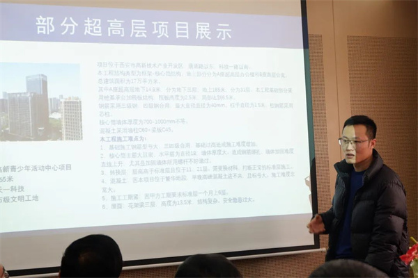 總經(jīng)理宋管理和項(xiàng)目經(jīng)理習(xí)鑫分別就公司近三年承建的部分公建類項(xiàng)目、商業(yè)綜合體類項(xiàng)目、住宅類項(xiàng)目以及超高層項(xiàng)目進(jìn)行了重點(diǎn)介紹和詳細(xì)講解。