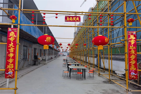 玉兔迎新,萬象更新,1月21日,農(nóng)歷大年三十,在這個萬家團圓、舉國歡慶的日子,為保障工程建設(shè)進度臻誠實業(yè)集團多個項目不停工,建設(shè)者們毅然選擇堅守崗位一線,為了讓大家在項目上也能過好年公司精心安排了項目團圓飯,現(xiàn)在,小編帶您一起走進菁英公寓公租房項目的年夜飯現(xiàn)場,大家貼對聯(lián)、掛燈籠、包餃子、拜新年……在紅紅火火的氛圍里,體驗不一樣的年味,感受家一樣的溫暖。